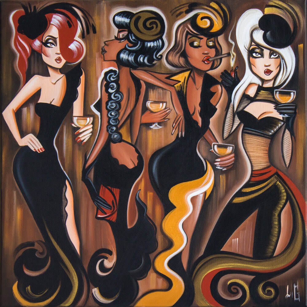 She says of her work “When I paint, I mix bold colours and feminity to depict women in an attractive and fun way. I just enjoy representing Pin-up style ladies with a twist of humour. I want to show empowered, independent and modern women. I love finding new composition for each painting and drawings.I like to tell stories and to make the spectator smile”.